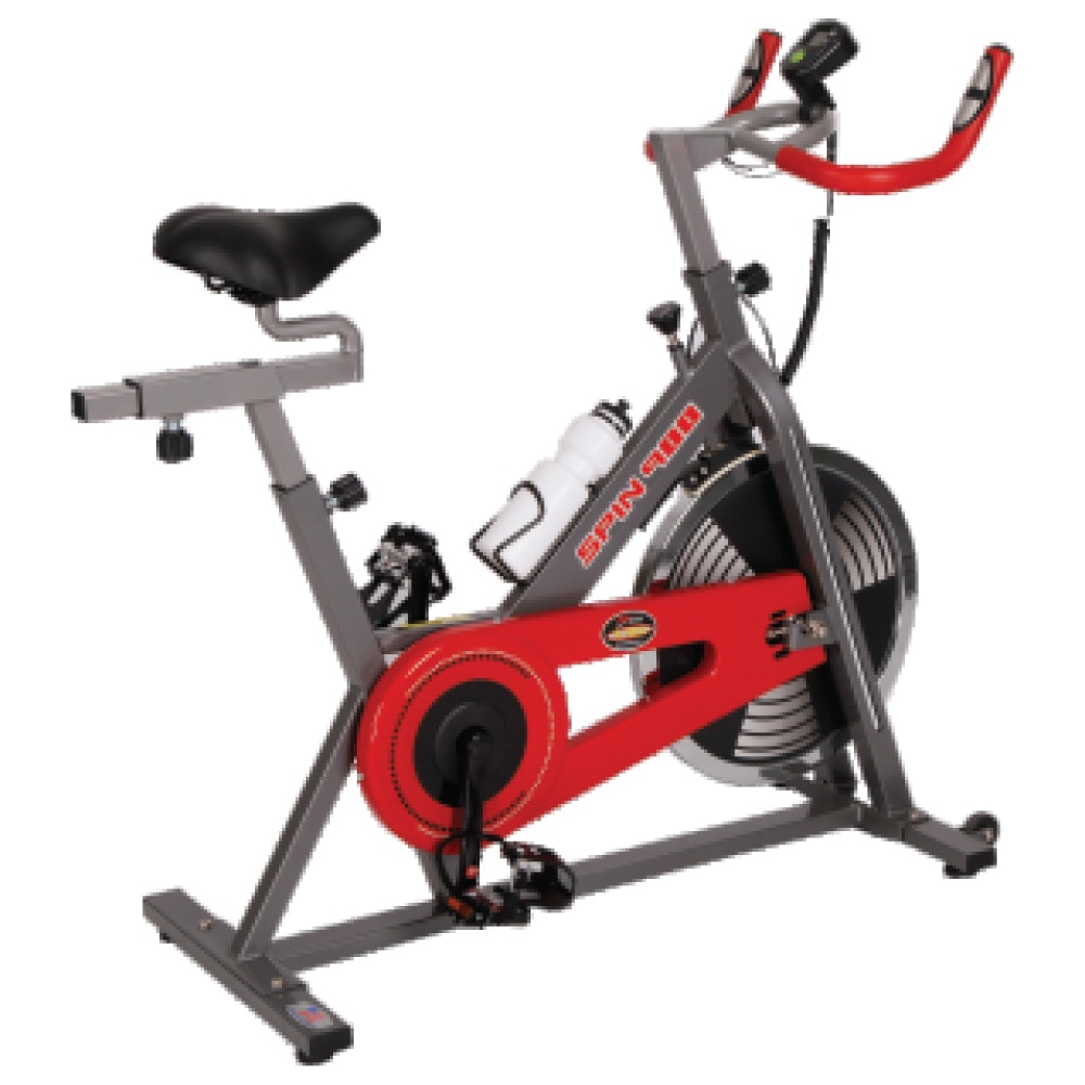DELUXE SPIN BIKE. STEP THROUGH FRAME FOR EASY ACCESS. COMPUTER DISPLAY TIME, SPEED, DISTANCE, CALORIE AND PULSE. EXTRA STRONG STABLE STEEL FRAME FOR THE MOST DEMANDING USERS. COMPLETELY ADJUSTABLE SEAT. COMFORTABLE PEDALS AND CONSOLE ANGLE FOR OPTIMUM ERGONOMIC. 2 WAY FLY WHEEL 3 PCS. CRANK AND 14 KG. OF ROTATING MASS ENSURES SMOOTH AND DYNAMIC MOVE
